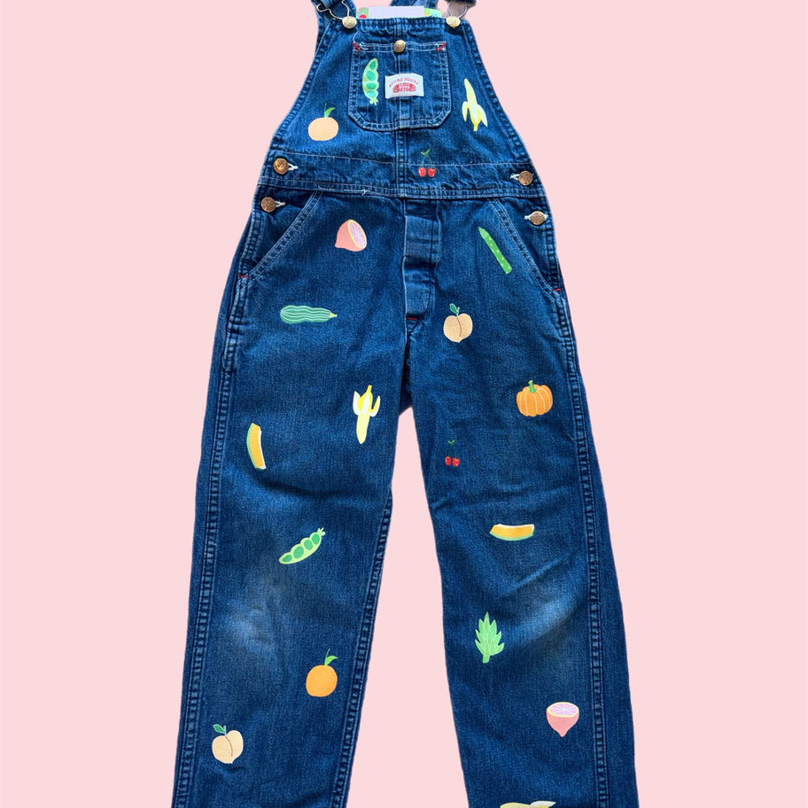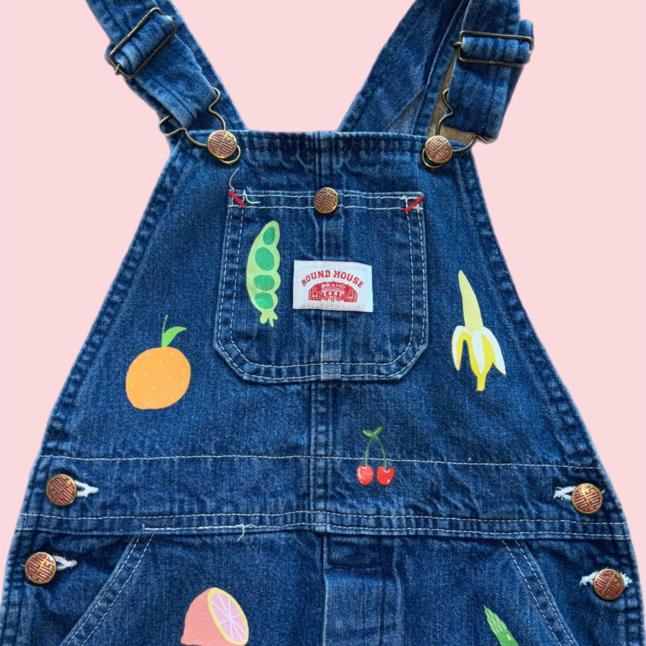 I lovingly printed my fruit and veggie doodles all over this one of a kind pair of vintage kids overalls because bright produce and tiny clothes is one of my favorite combinations.