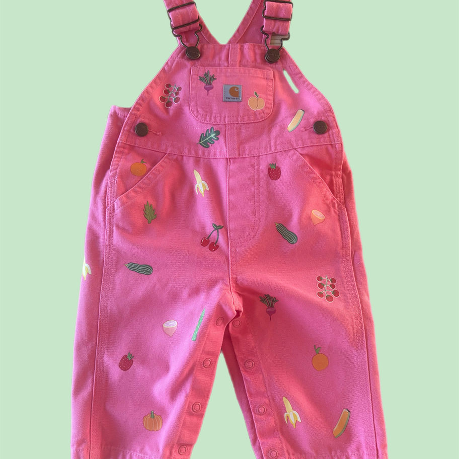 I lovingly printed my fruit and veggie doodles all over this incredible pair of vintage baby overalls because tiny clothes plus happy produce just felt like the right combination.