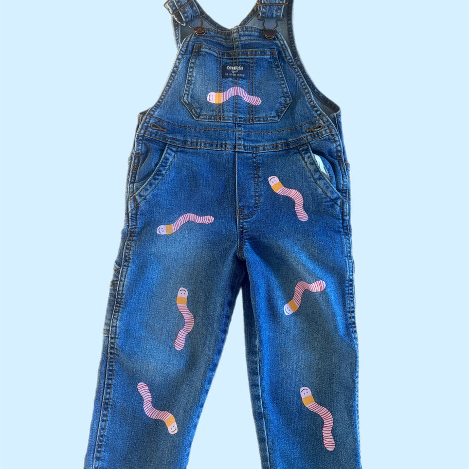 I lovingly printed my happy pink wiggly earthworm doodles all over this one of a kind pair of vintage kids overalls because worms deserve good PR and they make me smile.