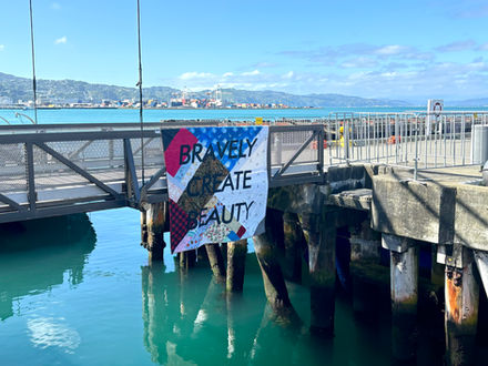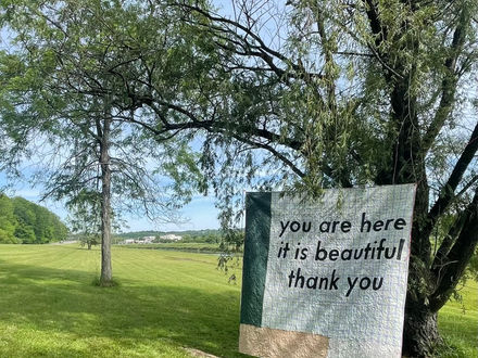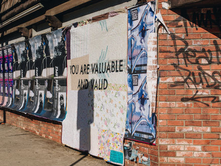 Since 2020, Nicole has collaborated with her husband, artist Luke Haynes, to create hand-sewn quilts painted with her original writing. Each quilt is placed anonymously in a public space with a small label letting the viewer know it’s free to take and do what they need with it. Over 50 quilts have been installed worldwide—in parks, outside hospitals, along sidewalks—as quiet offerings of comfort and care. Select quilts have also been exhibited in the South Bend Museum of Art, the Wisconsin Museum of Quilts & Fine Arts, and QuiltNSW in Australia.